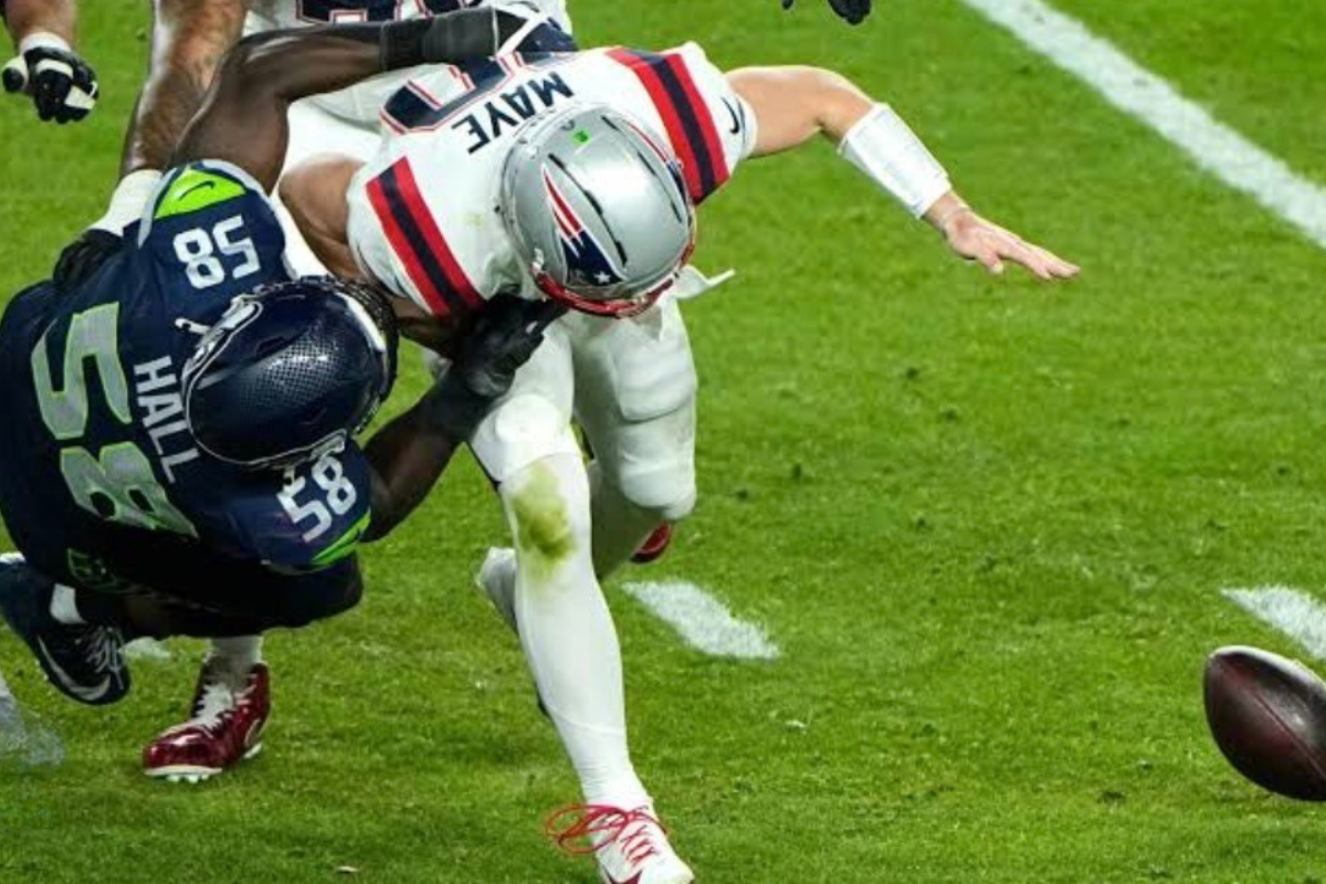 Seattle Seahawks linebacker, Derrick Hall (58), strip sacks New England Patriots quarterback, Drake Maye (10), in Super Bowl LX in Santa Clara, CA on Sunday February 8, 2026