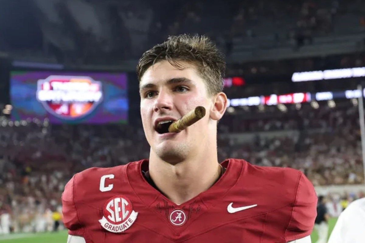 Alabama quarterback,Ty Simpson, enjoys a celebratory cigar after beating Tennessee on October 18, 2025.